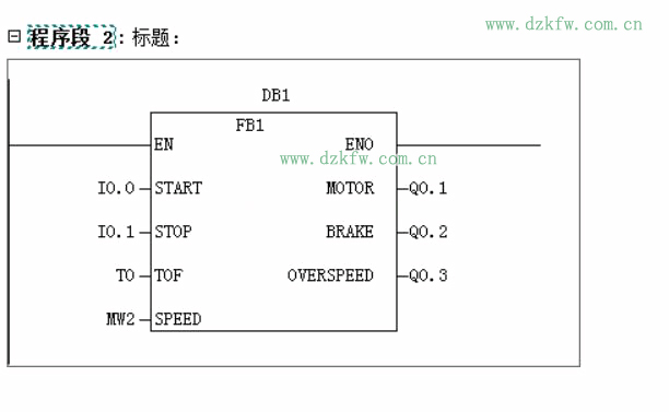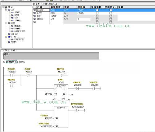 要求:按下输入参数START启动,按下输入参数STOP后,TOF指定的断电延时定时器开始启动,输出参数BRAKE(制动)为1,经过设置时间后,停止制动。输入参数SPEED与静态变量PRESPEED比较,SPEED大于PRESPEED时,输出参数OVERSPEED为1。FB1变量声明表如下: