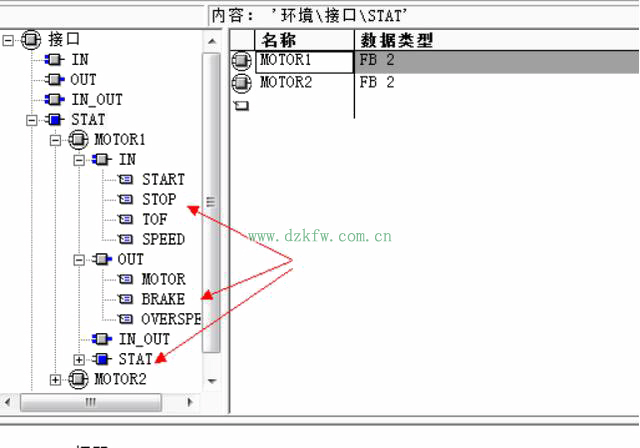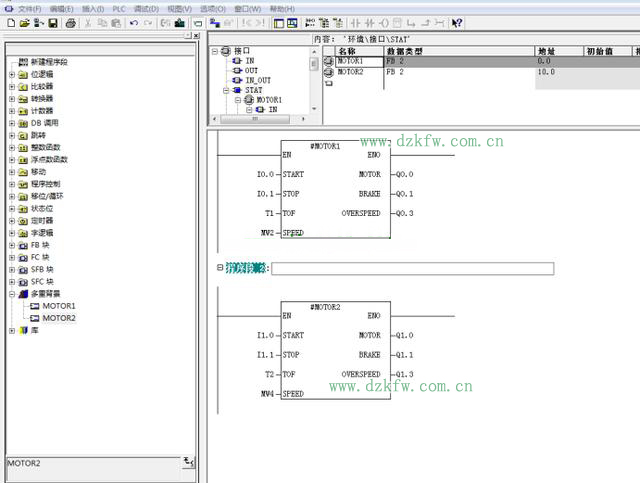 变量声明变量表中的MOTOR1和MOTOR2中的8个变量与FB2中的8个局部变量相同。如下图