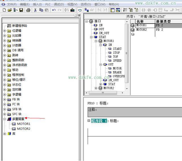 在FB10的变量表中声明了名为MOTOR1和MOTOR2的静态变量(STAT),其数据类型为FB2,如下图;这里要注意FB2也要为多重背景,
