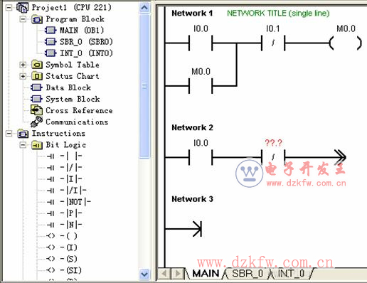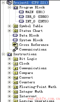 新建的程序文件以“项目1(CPU221)”命名,括号内为系统默认plc 的型号。项目包括7 个相关的块。其中程序块中有1 个主程序,1 个子程序SBR-0 和1 个中断程序INT-0。