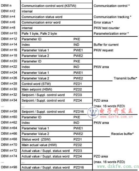 在本例中PKW 发送区为DB100.DBW22~28,PZD 发送区为DB100.DBW30~36,PKW 接收区为DB100.DBW38~44,PZD 接收区为DB100.DBW46~52 (n 为2) 。后续站数据结构与之相同,每个站占用26 个字。PKW 数据发送时,要置位通讯控制KSTW 第一位一次,在本例中为 DB100.DBX3.0,然后被程序复位。