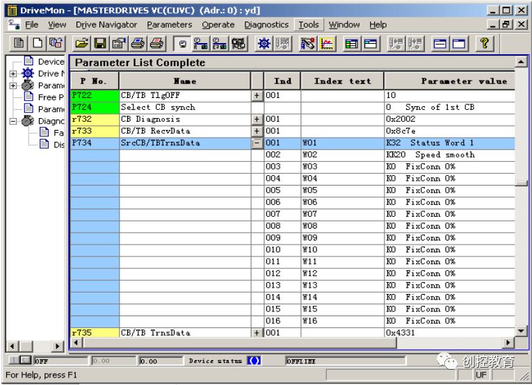 即 DB15.DBW12~DB15.DBW22对应 P734的 W01~W06。B15.DBW0~DB15.DBW11对应 k3001~k3012。PLC 读取变频器的数据可以通过设置参数 P734的值来实现,PLC写给变频器的数据存放在变频器数据 k3001~k3012 中,在变频器的参数设置里可以进行调用,从而建立了彼此的对应关系。