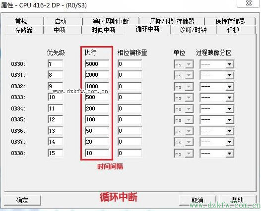 循环中断OB的等距启动时间是由时间间隔和相位偏移量决定的。在“硬件组态”中,可以定义循环中断的优先级、两次中断之间的时间间隔以及相位偏移量(在S7-300系列CPU中,只能定义时间间隔),如下图所示。