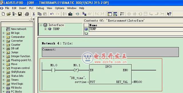 在程序中调用SFC0,将存放设定时间的DATA_AND_TIME变量以符号名的方式赋给SFC0的PDT形参,返回变量赋值给MW100,这样当M0.0由0到1时SFC0被执行。