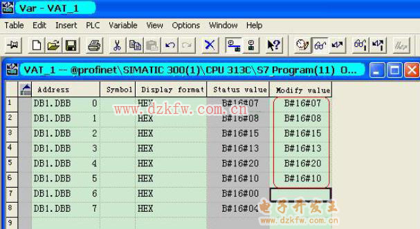 在程序运行后打开监视和修改变量表即可观察到最后一个字节DB1.DBB7的低4位已经被系统自动计算为4即星期三。