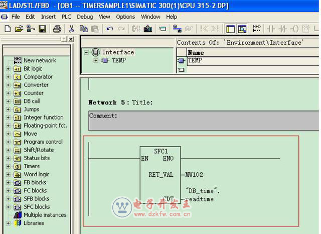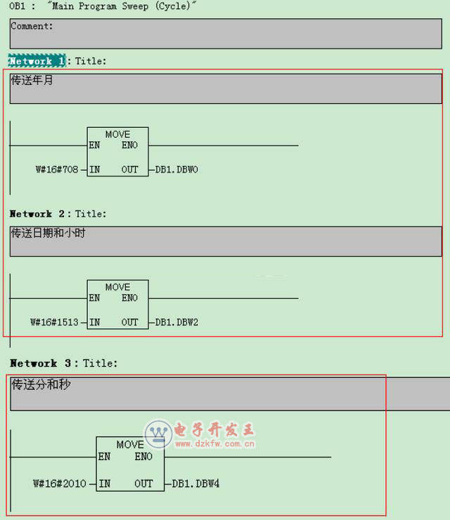 在OB1中调用SFC1读取系统时钟并将系统时间传送给“DB_time”.readtime变量: