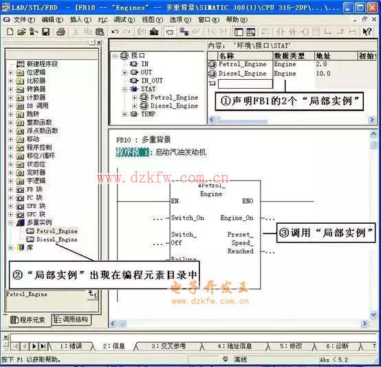 (4) 规划程序结构。程序结构规划如图3所示。FB10为上层功能块,它 把FB1作为其“局部实例”,通过二次调用本地实例,分别实现对汽 油机和柴油机的控制。这种调用不占用数据块DB1和DB2,它将每次调用(对于每个调用实例)的数据存储到体系的上层功能块FB10的背景数据块DB10中。