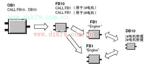 像这种情况,我们就可以利用多重背景数据块来减少数据块的使用量。拿本例来说,我们就可以在OB1中调用FB10,再在FB10中分别调用(每台电机各调用一次)FB1来控制两台电机的运转。对于每次调用,FB1都将它的数据存储在FB1的背景数据块DB1中。这样就无需再为FB1分配数据块,所有的功能块都指向FB10的数据块DB10。原理图如下: