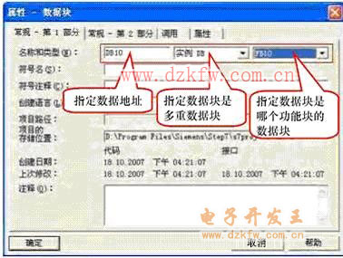 其次,需要在FB10中指定其所包含的背景数据块。方法如下:在FB10局部变量定义窗口中,在“STAT”变量区中(必须在此变量区中)为每台电机的控制取好名称后,数据类型选择FB <nr>,确认后,再把<nr>改为1,即功能块FB1。如果你在变量表中已经定义了FB1的符号,则会自动出现其符号名。地址一般由CPU根据FB1的接口参数数量自动计算得到,采用默认值就可以了。