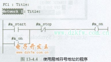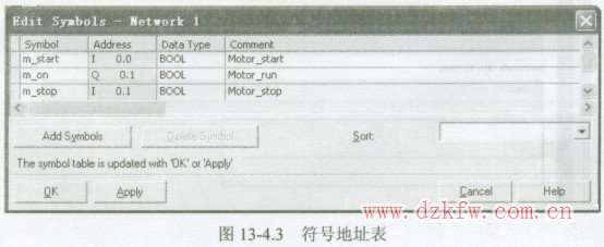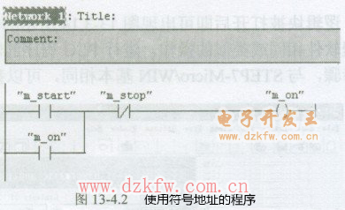 虽然使用绝对地址编程容易、方便,程序简单,但是在程序较复杂时,会带来程序理解、阅读方面的难度。因此,为了便于程序的理解,方便他人阅读程序,对于较复杂的程序,在PLC中一般可以采用利用文字编辑的“符号( Symbol)”来表示信号的地址,例如,在程序中直接使用“m—start”这一名称来代表电机启动信号的输入IO.O等,这样的地址称为“符号地址”(见图13-4.2)。