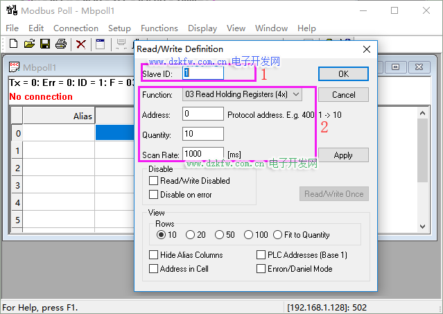 Slave ID保持一致为1,Function使用默认参数,注意这里地址设置为0,与Server端地址相差1,Quantity是设置的寄存器数量,下次给大家分享pymodbus库时会有很好的对应说明,这里面了解下即可。Scan Rate使用默认的即可。下方的View Rows 是对可以看见的区域设置,随便点点,没什么大问题的。