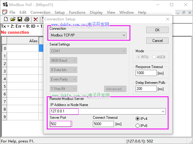Connection 默认选择的是Modbus TCP/IP,下方是远程Modbus Server的设置,像网络调试助手一样连接服务器一样,需要设置服务器的Ip和Port.其余参数使用默认传参数即可。之后点击【OK】按钮即可。