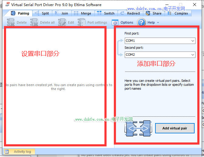 我们分成两个部分,左边是虚拟串口的设置,右边是虚拟串口的添加