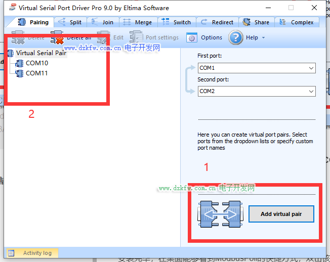 我这里选择COM10跟COM11 点击Add virtual pair在左边就可以看到建立的虚拟串口。
