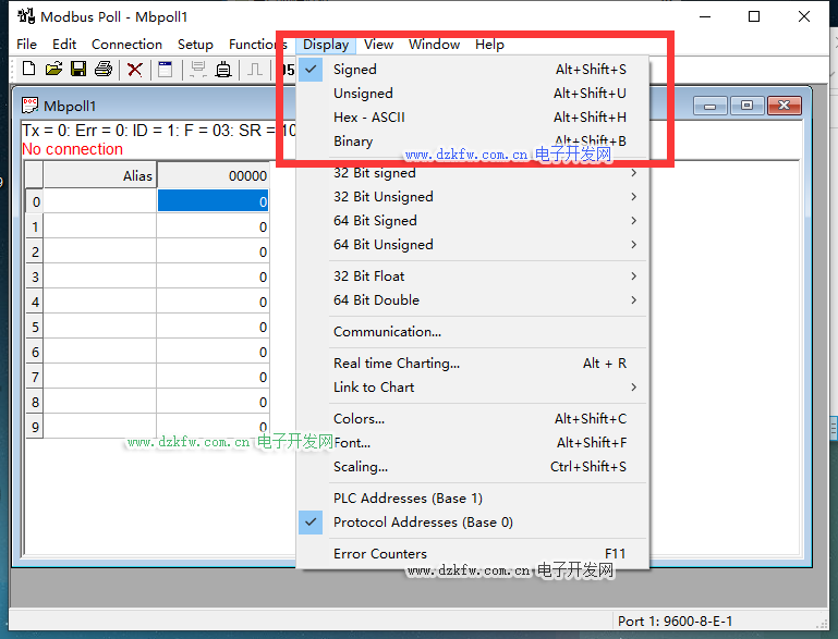 点击Display可以设置数据的显示方式,默认为Signed方式(16进制无符号二进制),数据范围为-32768~32767