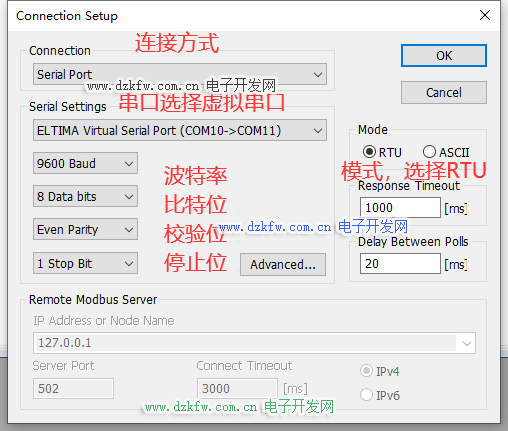 端口主从机分别选择我们虚拟出来的com10和com11端口,其他选项如波特率9600,比特位8,校验位1,无等价位等可以保持不变,然后点击确定进行连接,未连接成功窗口第二行会给出提示信息。
