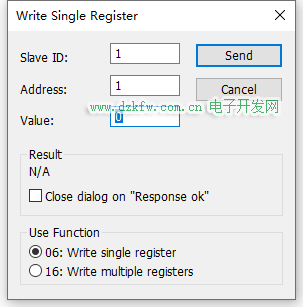 主机修改寄存器值,从机寄存器值会改变 功能码06