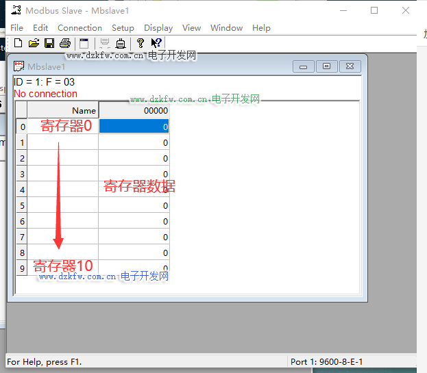 • ID = 1表示模拟的Modbus子设备的设备地址,图中地址为1;