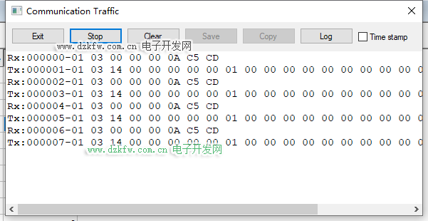 点击“Display”----“Communicatio”,可以调出串口收发数据帧监视信息对话框,用来查看分析收发的数据帧。如下图所示: