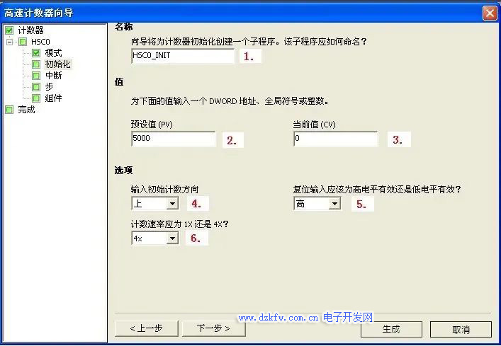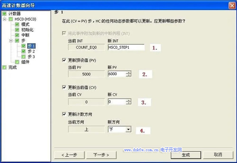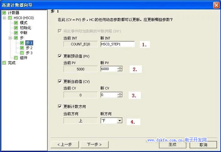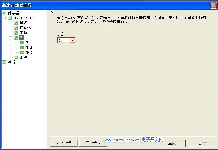 当前值等于预置值时产生的中断,通过向导,可以在该中断的服务程序中重新设置高速计数器的参数,如预置值、当前值。一个这样的过程称为'一步'。