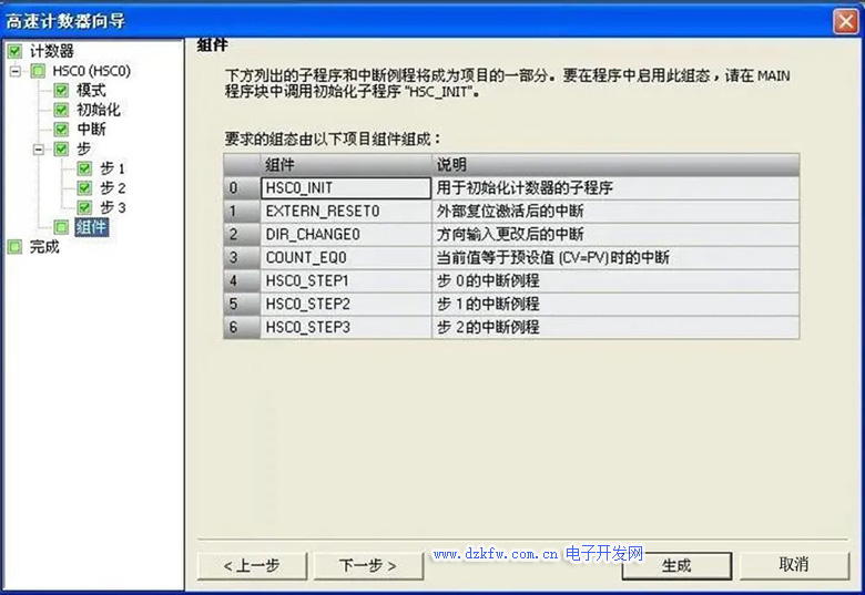 点击向导对话框左侧树形目录中的选项“组件(Components)”可以看到此时向导生成的子程序和中断程序名称及描述,点击“生成(Generate)”按钮,完成向导。