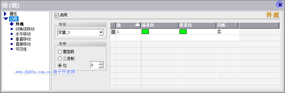 (2)图形控件:在工具栏建立一个圆,Q0.0设置如下图,Q0.1设置和Q0.0设置一致,把变量改成Q0.1即可。
