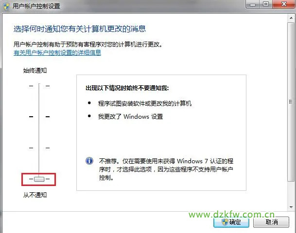 3. 在打开的窗口中选择“从不通知”,然后重新启动电脑,再次测试PC ACCESS SMART 软件。