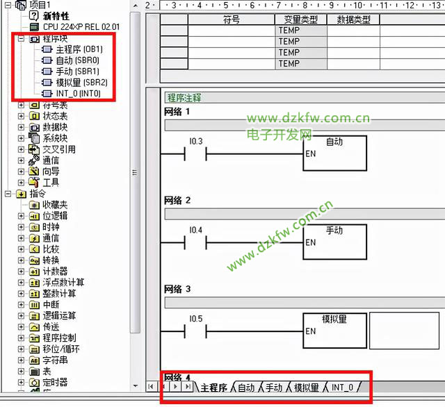 S7-200系列CPU控制程序由主程序OB1、子程序SBRO和中断程序INTO组成,STEP7-Micro/WIN在程序编辑窗口为每个POU(程序组织单元)提供一个独立的页。主程序总是在第一页,后面是子程序和中断程序。