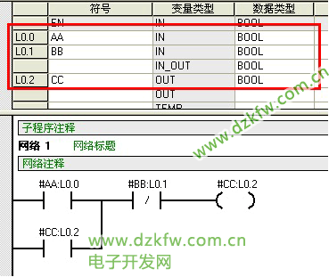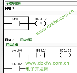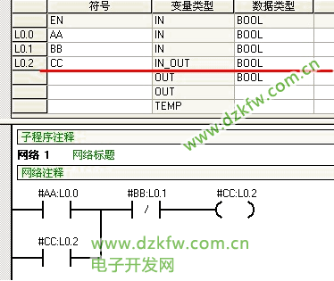那么当主程序第二次调用该子程序时,开辟临时存储空间,但是此时的存储空间与第一次调用时开辟的不一定一致。可是,也有可能由于程序简单,仍然使用第一次调用时占用的存储空间。如果这种情况发生了,那么第一次调用时已经将#CC的L0.2置了1,而此值依旧存在,那么第二次调用时虽然输入参数I0.2和I0.3为0 ,但是#CC(L0.2)为1,由于客户的子程序逻辑有自保持部分,所以最后L0.2的逻辑结果仍然是1。子程序完成后,#CC将值传送到输出参数Q0.1上,使其置1。所以就会出现客户反映的那种问题。