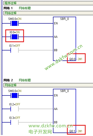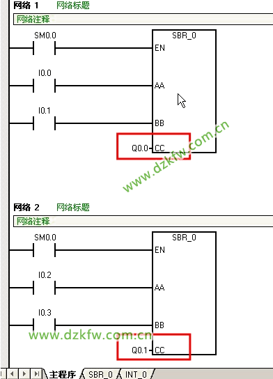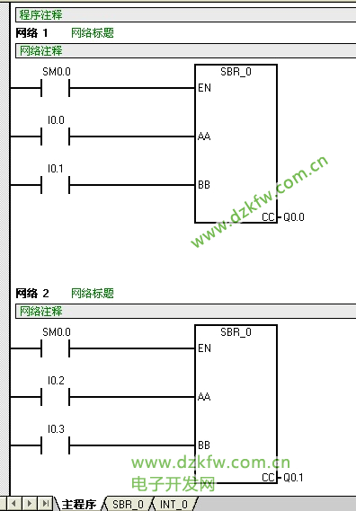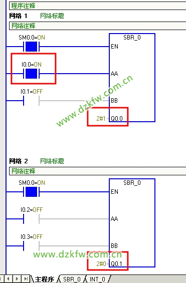主程序:调用了两次上面的子程序,实现I0.0和I0.1控制Q0.0的闭合和断开,I0.2和I0.3控制Q0.1的闭合和断开。