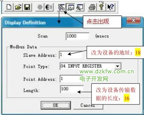 ③Length,长度,modscan工具最长可接100,也就是图中设的100,