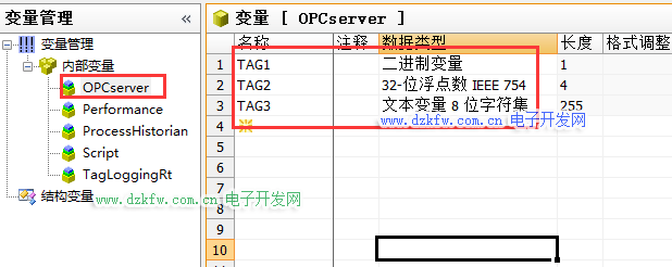 在内部变量中创建一个OPCserver的组别,然后在该组下创建了三个变量,分别是TAG1、TAG2、TAG3,类型分别是二进制、浮点数、字符串。然后在画面中创建对应的IO域,如下图所示: