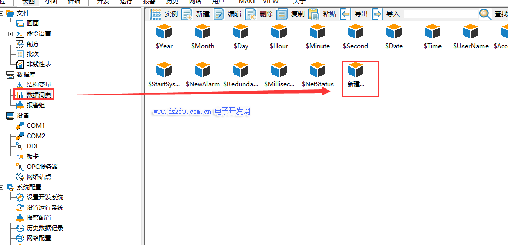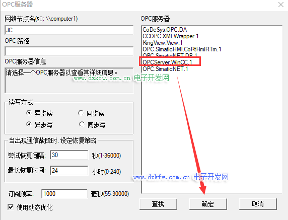 在右侧会显示出找到OPC服务器,我们选中OPCServer.WinCC.1,点击确定。后去选择数据词典,点击新建。
