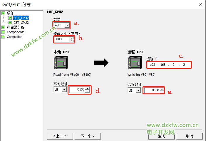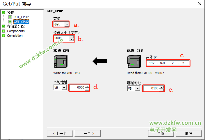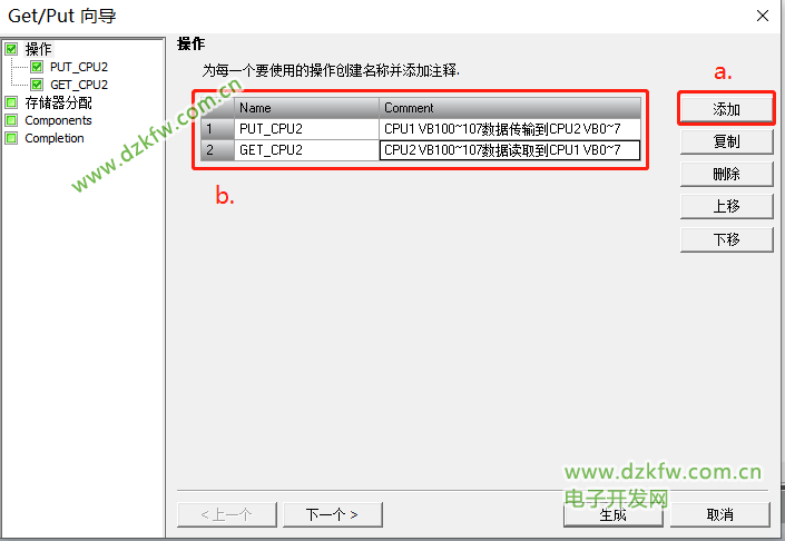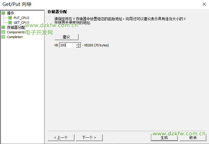 注意:点击“建议”按钮向导会自动分配存储器地址。需要确保程序中已经占用的地址、PUT/GET向导中使用的通信区域与不能存储器分配的地址重复,否则将导致程序不能正常工作。