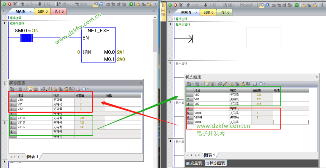 把主动端程序下载到CPU1中(192.168.2.1),被动端CPU2(192.168.2.2)不需要写程序,把空程序下载到CPU2中即可,打开状态图表监控和写入数据(见图7)。