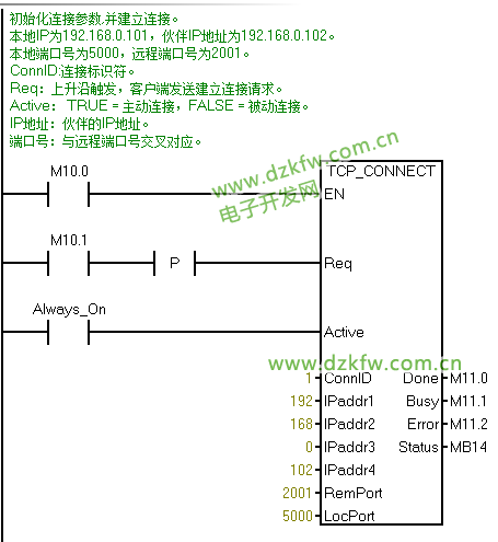 调用TCP_CONNECT指令建立TCP连接。设置连接伙伴地址为192.168.0.102,远端端口为2001,本地端口为5000,连接标识ID为1。利用SM0.0使能Active,设置为主动连接。