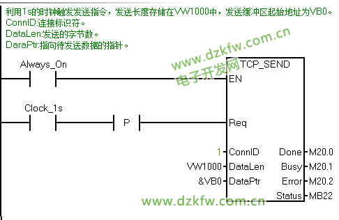 调用TCP_SEND指令发送以VB0为起始,数据长度为DataLen长度的数据发送到连接ID为1指定的远程设备。