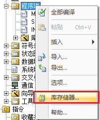 开放式用户通信库需要使用 50 个字节的 V 存储器,用户需手动分配 。在指令树的程序中,以鼠标右键单击程序块,在弹出的快捷菜单中选择库存储器。如图所示: