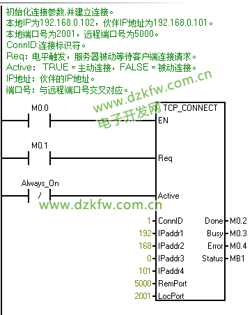 调用TCP_CONNECT指令建立TCP连接。设置连接伙伴地址为192.168.0.101,远端端口为5000,本地端口为2001,连接标识ID为1。利用SM0.0常闭点使能Active,设置为被动连接。