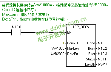 调用TCP_RECV指令接收指定ID连接的的数据。接收的缓冲区长度为MaxLen,数据接收缓冲区以VB2000为起始。
