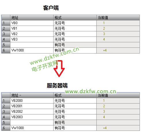 将作为客户端的PLC(IP地址为192.168.0.101)中VB0-VB3的数据传送到作为服务器端的PLC(IP地址为192.168.0.102)的VB2000-VB2003中。