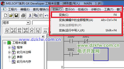 打开菜单栏中“工程-创建新工程”,会弹出“创建新工程”的窗口,可以选择PLC类型、程序类型和设定工程名。本文选择的是FX系列的FX2N,梯形图。点击“确定”,就回到主窗口中,开始编写梯形图程序,如下图所示: