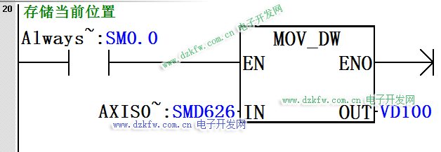在运动控制中经常需要断电后保存当前位置不丢失,以便上电后可以接着之前的动作继续运行,三菱PLC当前位置存储在特殊存储器D8340中,默认具有断电保持功能,所以不需要编程设置。然而西门子PLC当前位置默认则不具有掉点保持功能,那该如何实现断电保持功能呢?   以S7-200 SMART为例,0轴,1轴,2轴的当前值分别存储在特殊存储器SMD626,SMD676和SMD726中,SM存储器没有断电保持功能,可以将其传送到V存储器中进行断电保持,上电后再由V区恢复到当前位置中,就可以实现断电保持了。1) 断电前将当前位置传送到V存储区中。