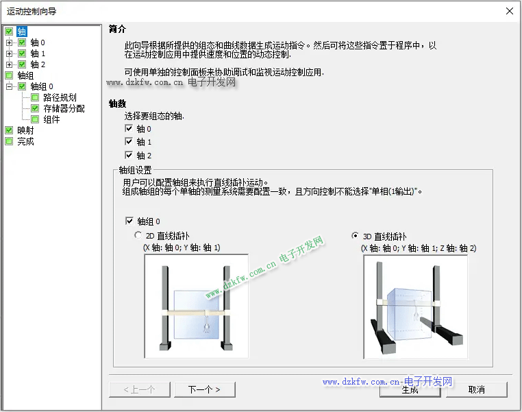 功能说明:通过运动控制向导轴组功能,实现2轴或者3轴的直线插补运动。轴组由轴组成,轴组和轴的关系是静态的,不支持动态配置。