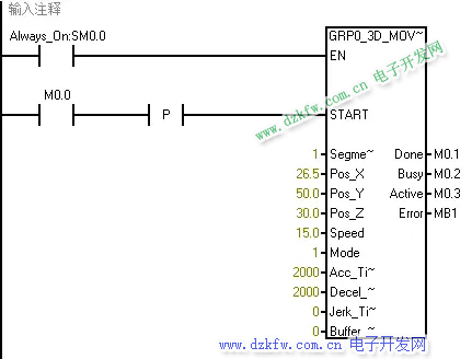 使用运动向导组态轴组,自动生成的GRP0_2/3D_MOVELINEAR指令,该指令控制轴组实现从实际位置到目标位置的 2D/3D 直线插补运动。