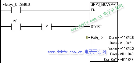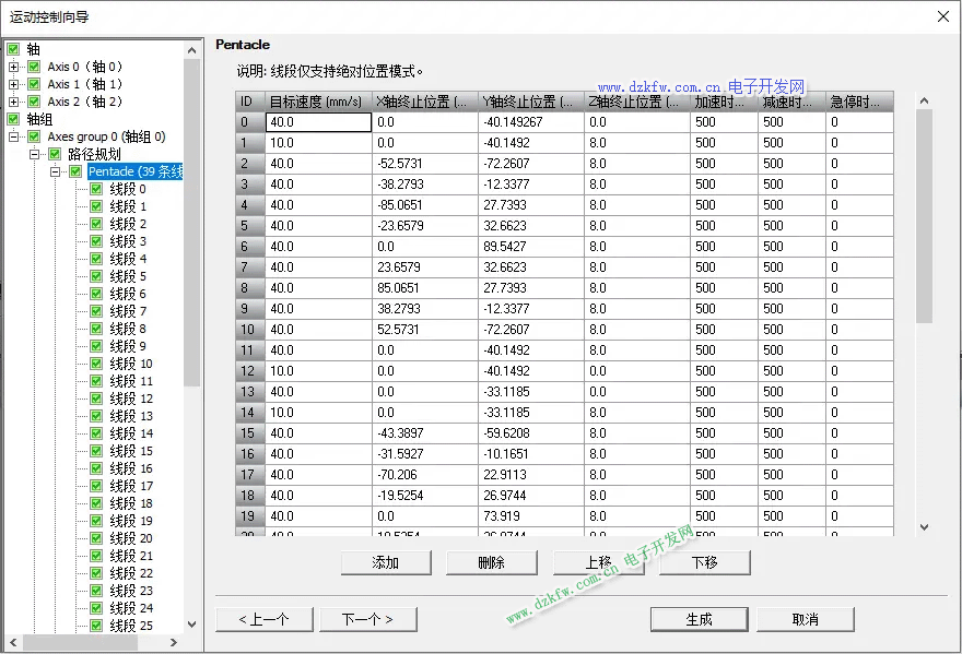 使用运动向导组态轴组,并在向导中对轴组的运动路径进行规划,使用向导生成的GRP0_MOVEPATH指令触发向导中规划的路径。轴组的路径规划功能可配置的路径最多为128条,轴组路径规划功能仅适用于绝对运动模式。