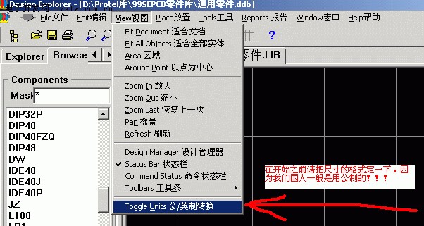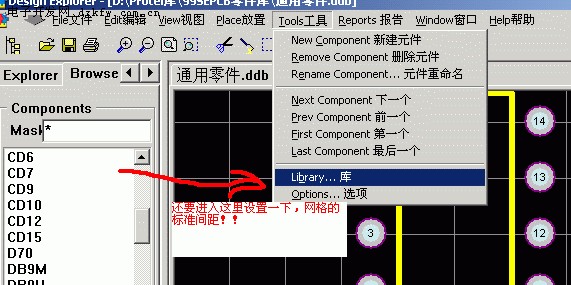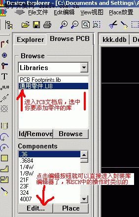 1.打开在前几课已经做过的PCB,选择那个我给大家提供的封装库,然后按着图选择编辑按纽就进入了PCB封装编辑器