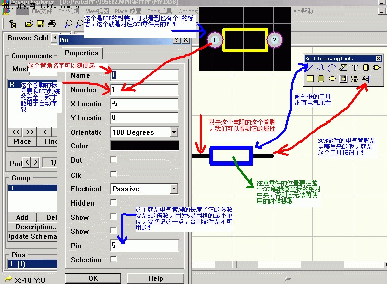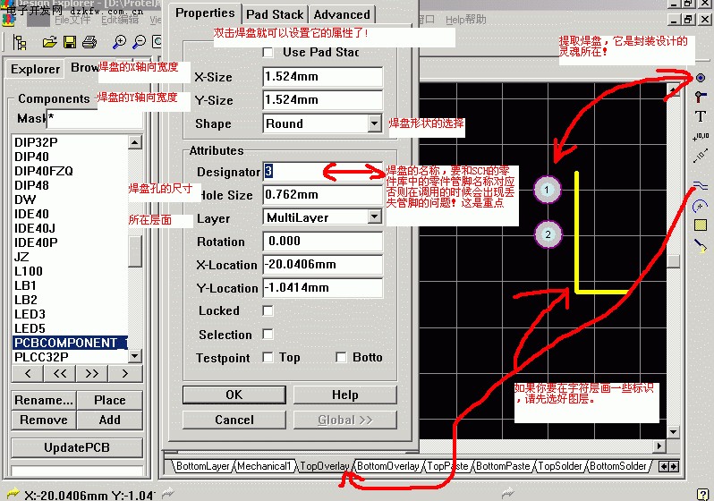 9.可以开始做封装了,注意哪些中文注释,核心问题就是焊盘的名称,但愿你还记得做SCH零件的重点>>