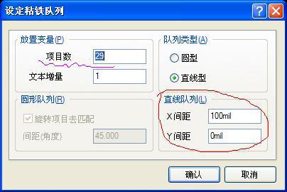 在“直线队列”中可根据你的实际情况填写。一般来讲DIP 封装的元件管脚间的距离是100mil 。X,Y,表示你的总线是横排还是竖排。确认吧!