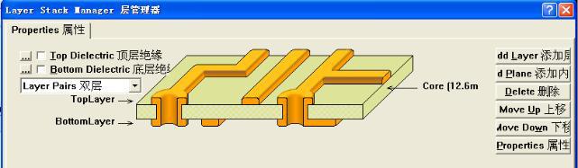 点击后弹出下面的层管理器对话框, 因为在Protel中默认是双面板,所以,我们看到的布线层只有两层。